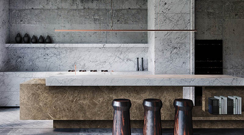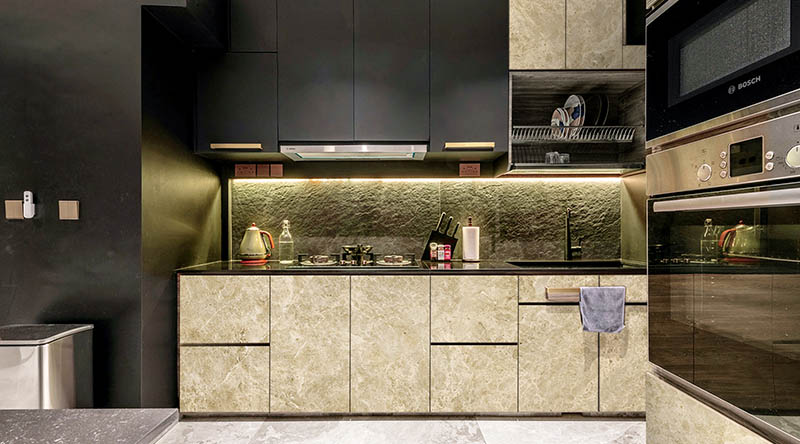 設計理念:仿制大理石紋原始美感,簡約、高冷,擁有中西結合的味道,十分顯格調。大理石肌理,賦予了櫥柜、賦予了圓桌、背景墻,賦予了家具,新的時尚質感與意義。